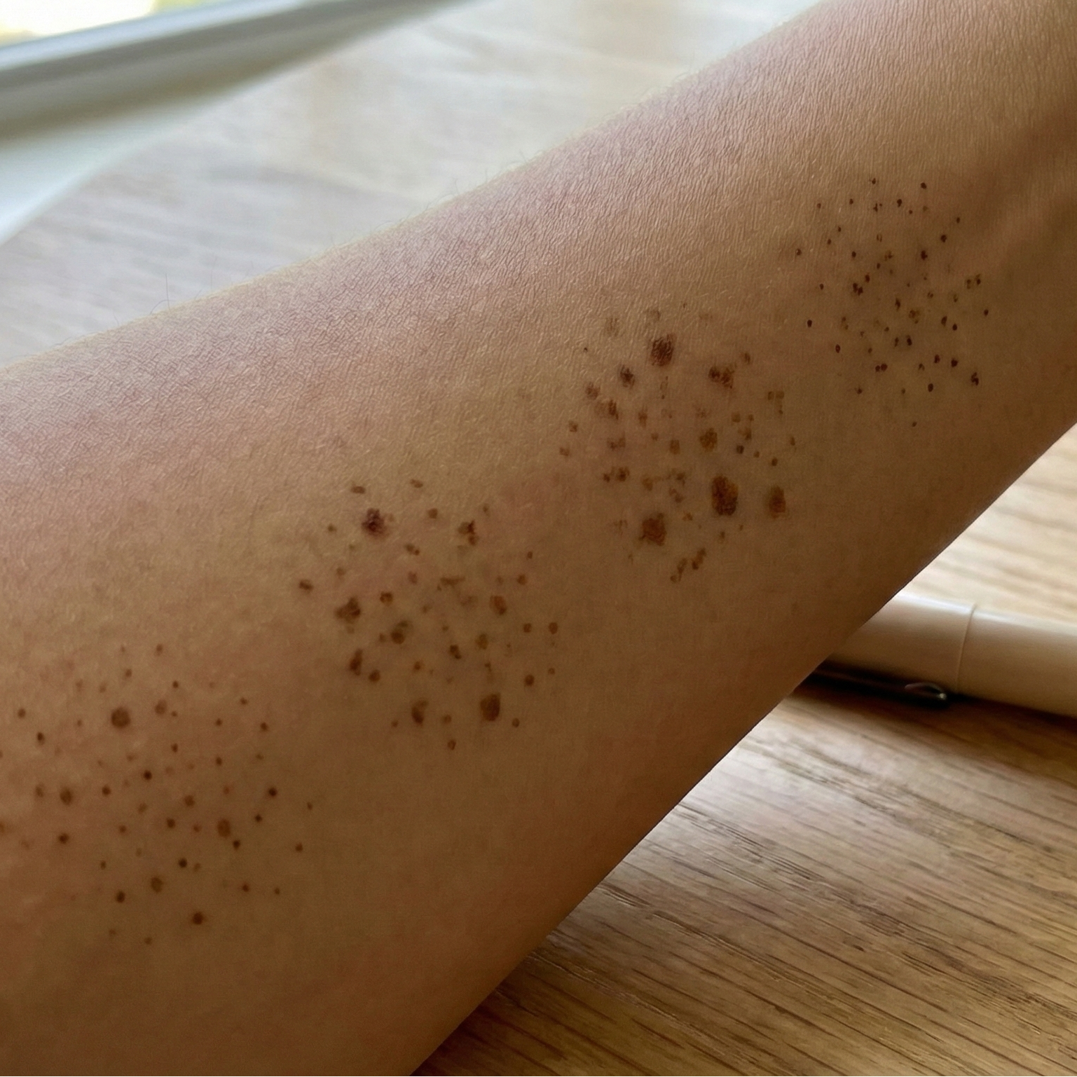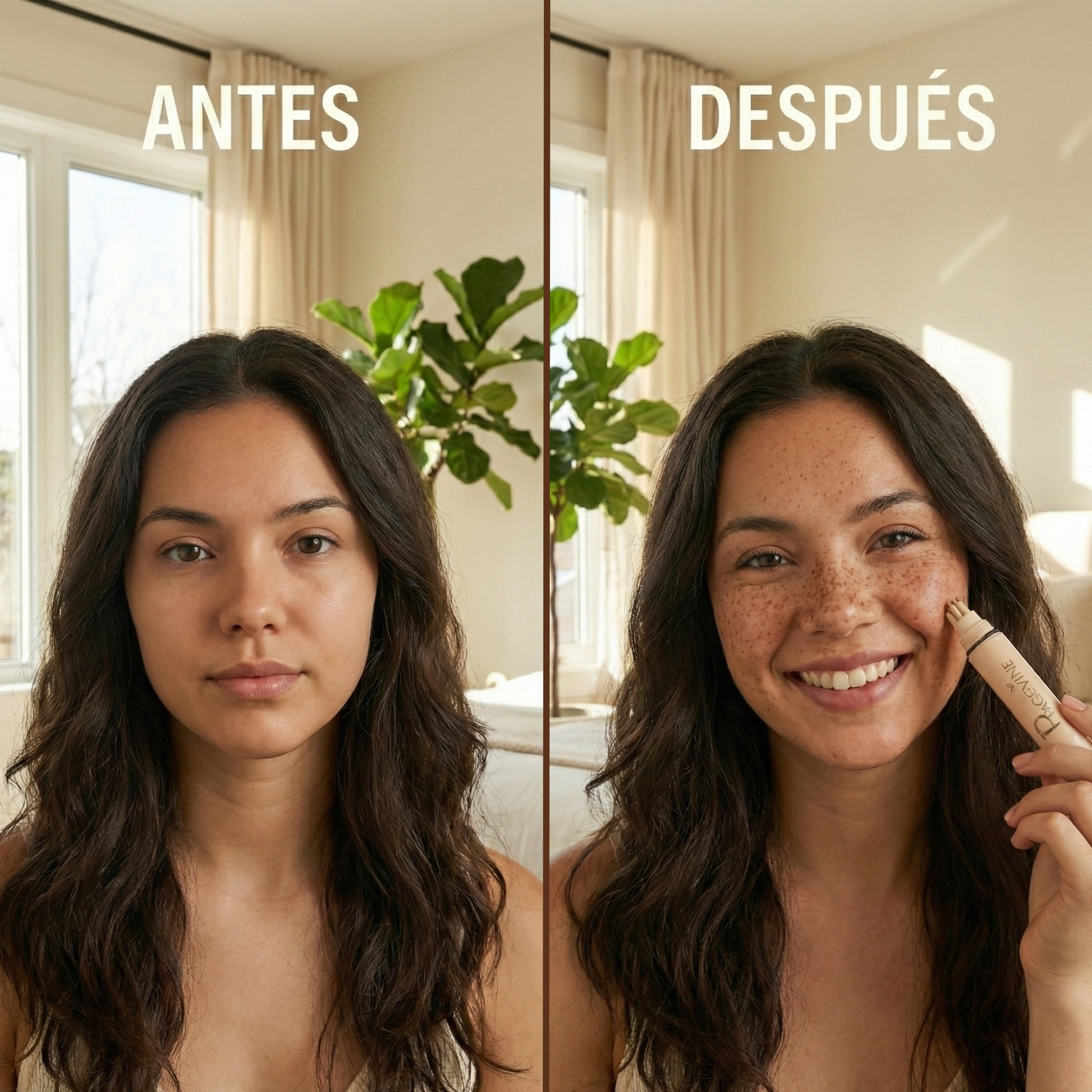 Olvídate de dibujar punto por punto. Nuestro innovador sello de 5 micropuntas recrea el patrón aleatorio de las pecas naturales en un solo gesto. Su fórmula líquida se funde con tu piel —no se queda encima— para un acabado "bañada por el sol" hiperrealista y resistente al agua que aguanta tu ritmo de la mañana a la noche.