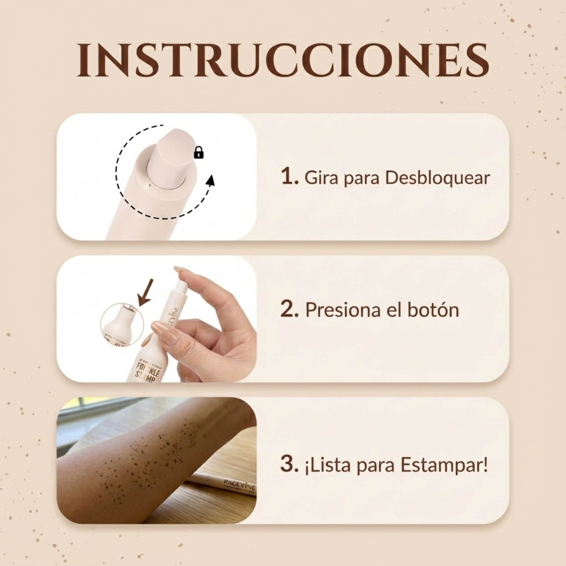 Aplica el sello sobre la piel con toques suaves y aleatorios. ¡Disfruta de tus pecas naturales al instante! ✨
